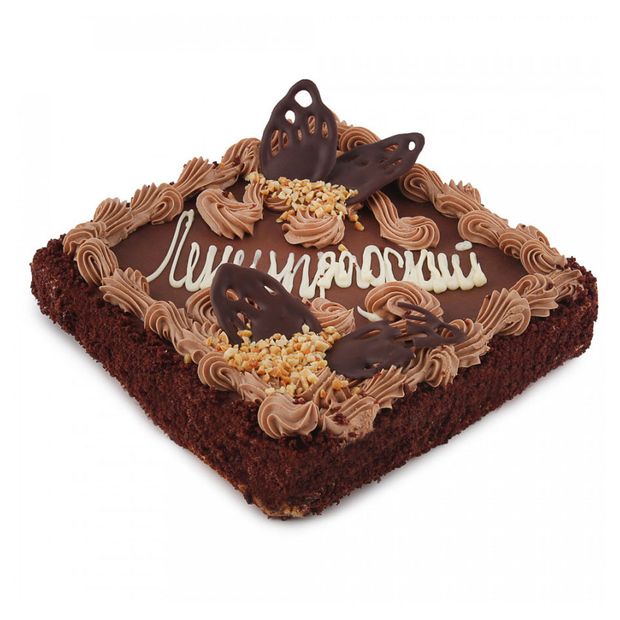Торт квадратной формы, состоящий из двух песочных коржей пропитанный яблочным повидлом и ванильно- сливочным кремом. Залитый сверху шоколадной глазурью. Бока торта обсыпаны бисквитно- шоколадной крошкой. Сверху украшен узором, декором и надписью из ванильного крема.