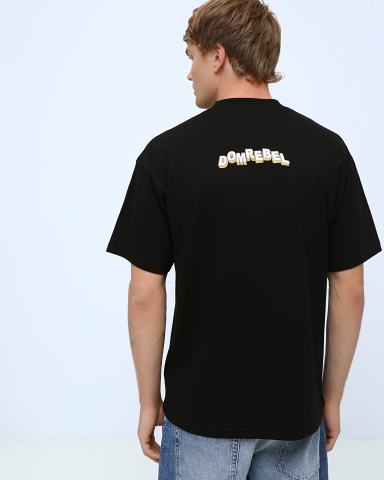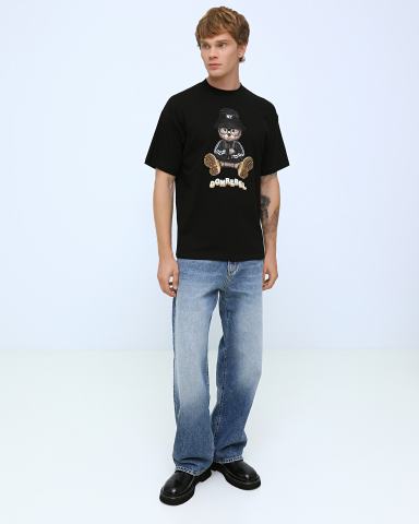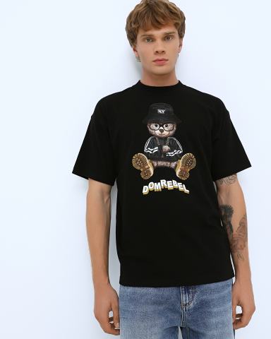 Чёрная футболка с принтом от DOMREBEL. DOMREBEL "ny bear" - футболка с фирменным принтом в виде плюшевого мишки спереди и логотипом бренда на спине. Футболка выполнена из 100% хлопковой ткани. Все изделия изготавливаются вручную, что приводит к небольшим вариациям от одного изделия к другому. Свободная посадка.