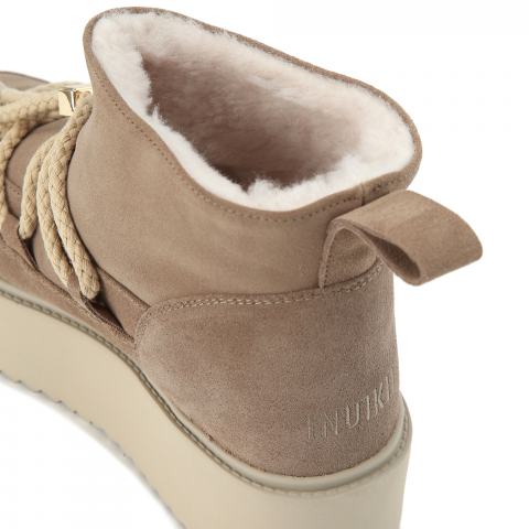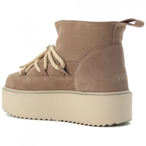Ботинки из натуральной замши в бежевом цвете Inuikii. Модель «Classic Low Platform» сочетает в себе моду с функциональностью. Верх из натуральной мягкой замши дополняет высокая подошва на платформе, позволяющая пройти по любой поверхности. Эта пара станет долговечным спутником для холодных сезонов. Подогнать посадку поможет текстильная шнуровка с замком. Внутри очень тёплые покладка и стелька из шерсти.