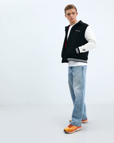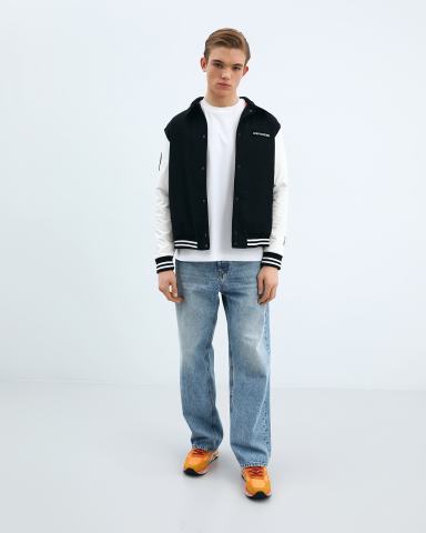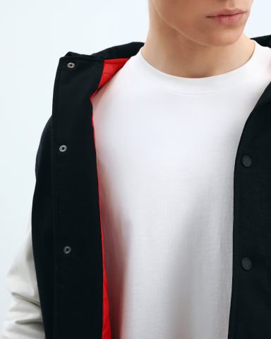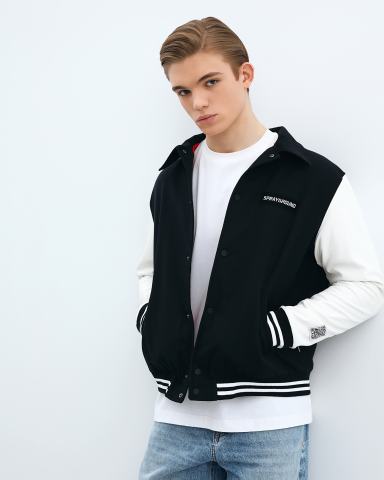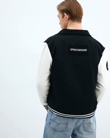 Куртка SPRAYGROUND из текстильной ткани. Бомбер в студенческом стиле белого и черного цвета прекрасно впишется в casual образы на весну. Бомбер выполнен из 100% хлопковой ткани. Боковые карманы, аппликация в виде фирменного логотипа на грузи и на спине, полосатый ребристый низ и манжеты, застёжка на кнопки.