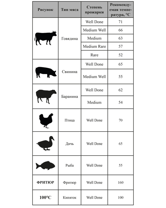 Соответствие степени прожарки и температуры готовности продукта представлено в таблице (см. фотографии).