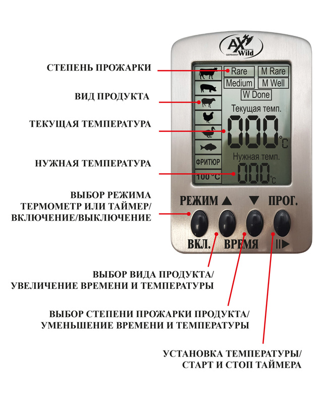 Полезной особенностью термотаймера является возможность контролировать температуру мяса в процессе приготовления шашлыка, гриля, барбекю и других блюд на открытом огне. Чтобы определить готовность мяса, не придется его разрезать.