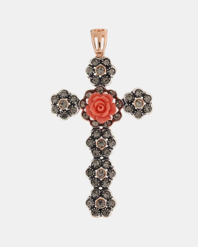Кулон в форме креста от итальянского бренда Eden с кристаллами и коралловой вставкой в форме розы. Если Вы цените готовые решения и предпочитаете носить украшения полноценными комплектами. обратите внимание на серьги (арт. 168071) и браслет (арт. 168070).