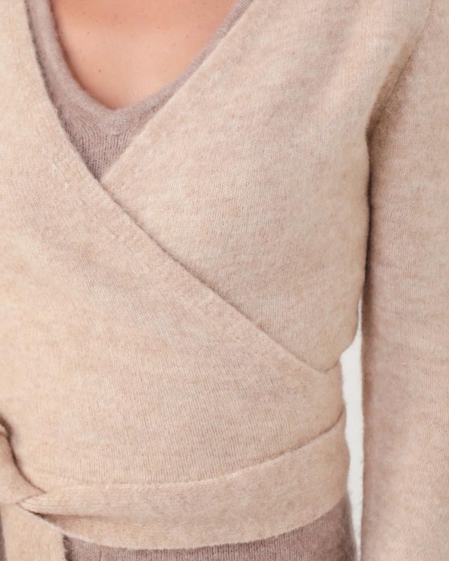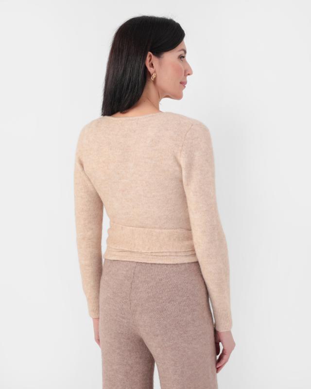 Укороченный пуловер лаконичного кроя на запах из коллекции бренда Friend of Audrey. Благородный бежевый оттенок подчеркивает элегантность модели.