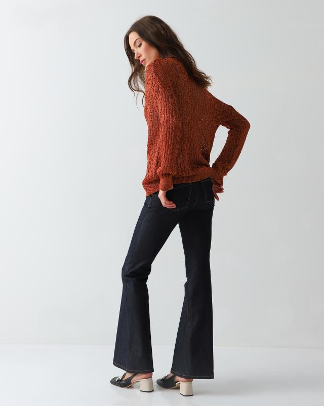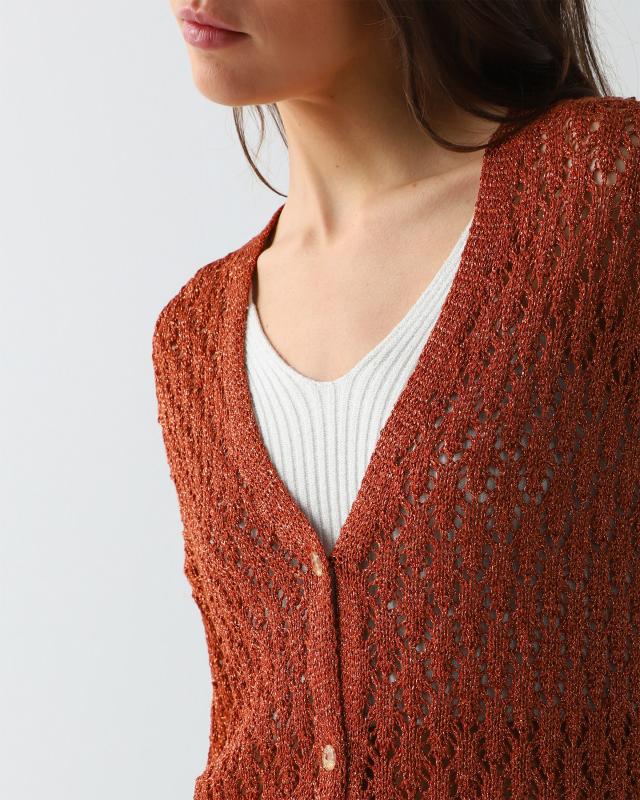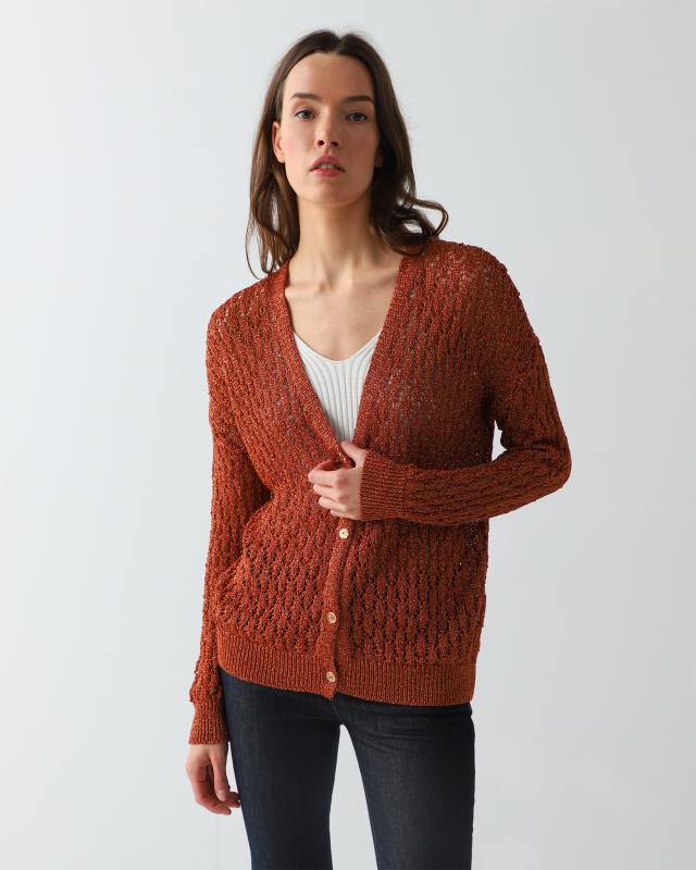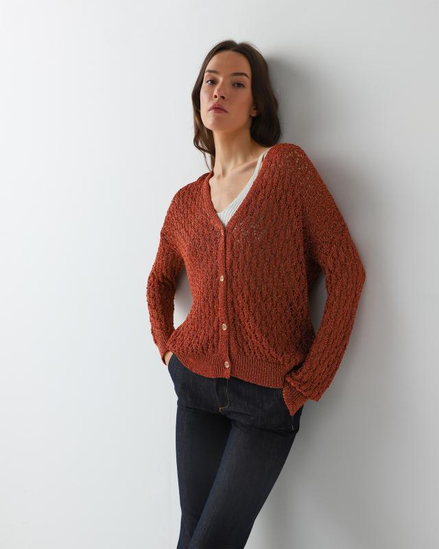 Бренд Lia Berti представляет оригинальный кардиган, выполненный из материала с вискозой в составе. Изюминку этой модели придает интересная ажурная вязка, напоминающая воздушное кружево, и металлизированная нить, которая поблескивает при попадании света. Изделие с V-образным вырезом застегивается на пуговицы. Чтобы подчеркнуть красоту рисунка, наши стилисты рекомендуют надевать его на однотонные топы – телесного или контрастных оттенков. В коллекции представлено два цвета: медно-коричневый и благородный серый.