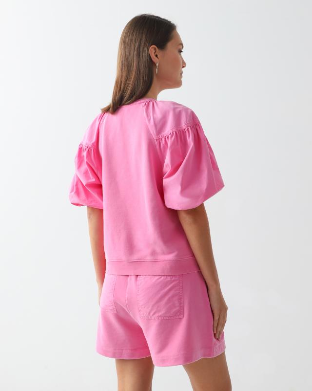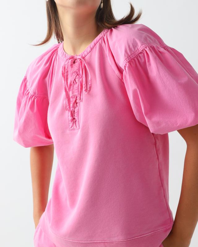 Блузка имеет рукава необычной формы, напоминающие фонарики. Это добавляет интересный акцент дизайну и придает блузке особый шарм. Блузка имеет вырез, который можно завязать на узел или бант. Этот приём создает элегантный и женственный вид и позволяет регулировать глубину выреза в соответствии с предпочтениями. Блузка изготовлена из хлопка, что делает ее мягкой, дышащей и приятной для кожи. Хлопок также является натуральным материалом, который обладает хорошей впитывающей способностью отводить влагу, что помогает поддерживать комфортный микроклимат на коже.