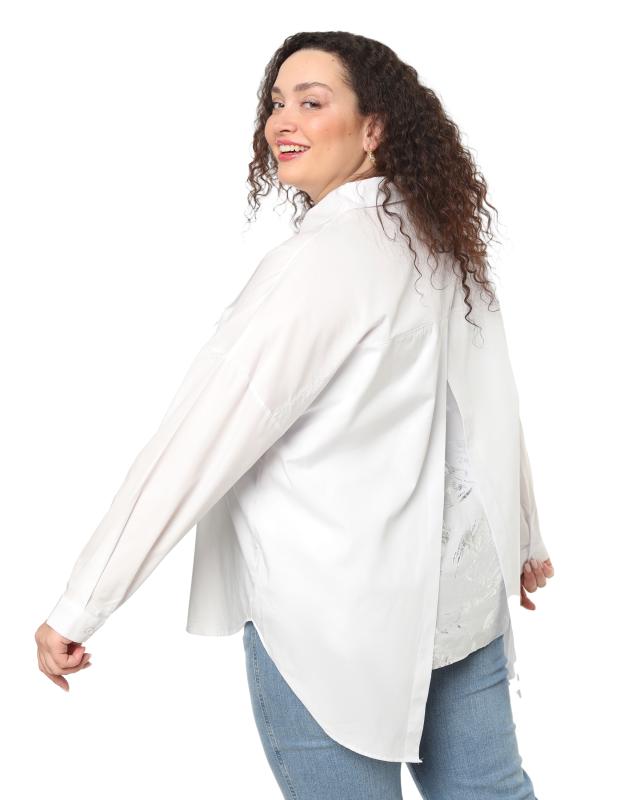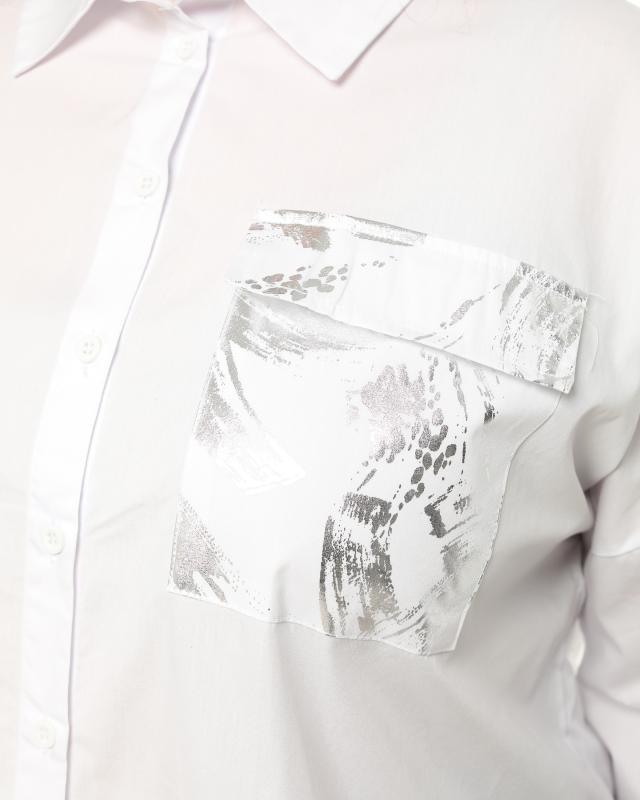 Рубашка из чистого хлопка бренда Atelier Paulette – классическая модель с эффектными деталями. Нагрудный карман и вставка на кокетке спинки декорированы абстрактным фольгированным принтом.