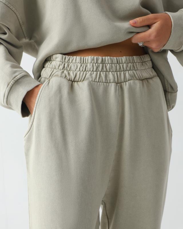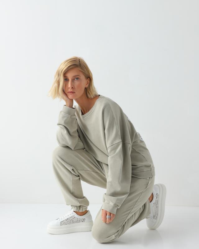 Брюки-джоггеры свободного силуэта – очень комфортная модель. На выбор предлагаются два приглушенных природных оттенка: бежевый и зеленый. Материал – трикотажный хлопковый футер, окрашен по технологии garment dye с эффектом варки. Материал после варки становится очень мягким и пластичным, красиво садится по фигуре.