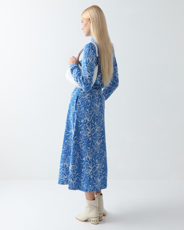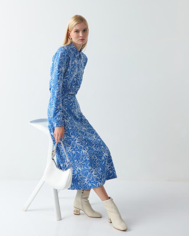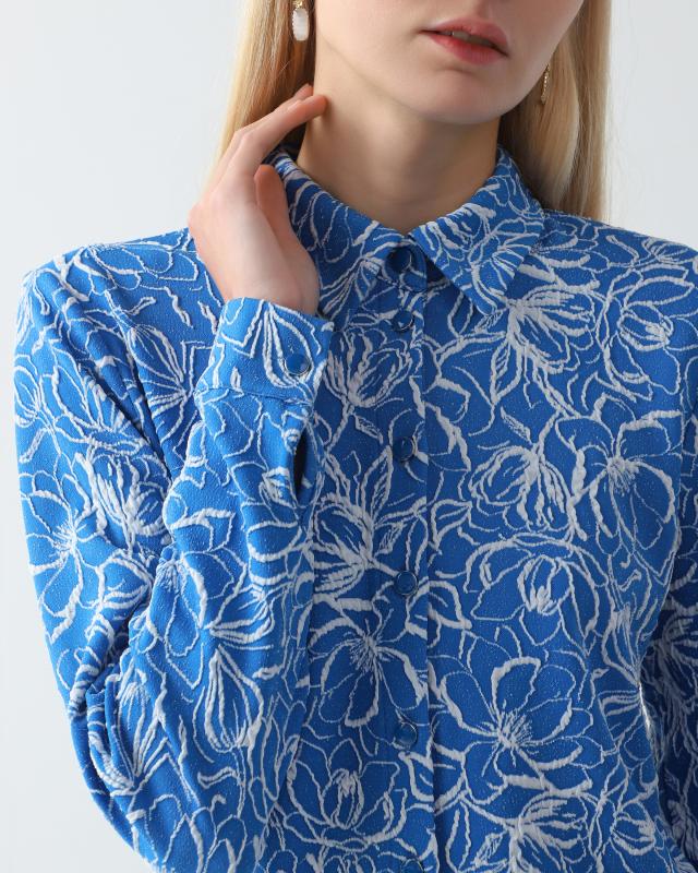 Рубашка с отложным воротником из коллекции бренда Villosa получилась комфортной и романтичной. Для пошива модели использовали фактурный эластичный материал с крупным цветочным узором. Эта вещь неизбежно попадает в центр внимания, но, благодаря сочетанию только двух оттенков, легко встраивается в разнообразные образы. Изделие с длинными рукавами застегивается на пуговицы. Рубашка представлена в двух цветовых сочетаниях: черная с белым узором и синяя с белым узором. Также в коллекции Villosa есть юбка из того же материала (арт. 182586) для полноценного костюма.