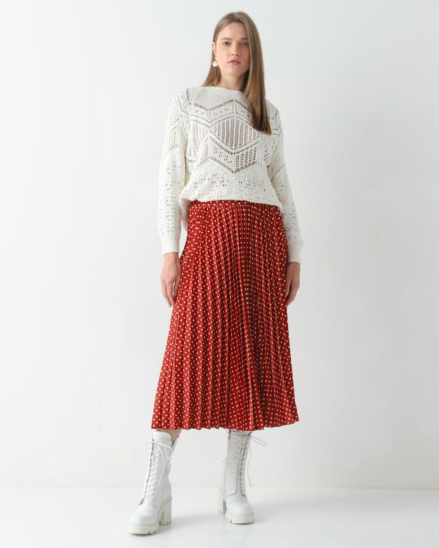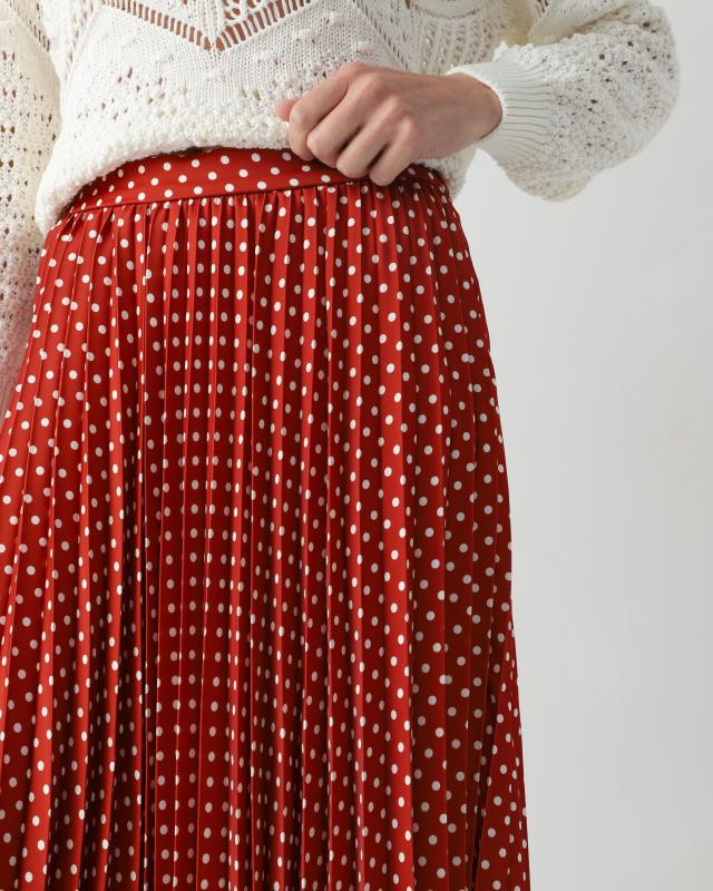 Дизайнеры бренда Lilly Bennet явно делали ставку на плиссированную юбку из новой коллекции, поэтому представили ее сразу в трех цветах: фиолетовом, терракотовом и синем. Для пошива модели с посадкой на талии использовали струящуюся ткань, которая хорошо держит форму, не мнется и не теряет насыщенность оттенков со временем. Мелкий белый горошек, украшающий материал, привносит легкий флер ретро. Юбка застегивается на скрытую молнию сбоку, на поясе – эластичная вставка для комфорта. Плиссированная модель может стать частью праздничного и повседневного образа.