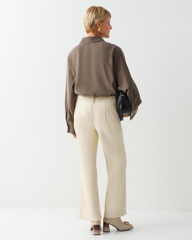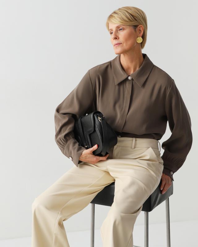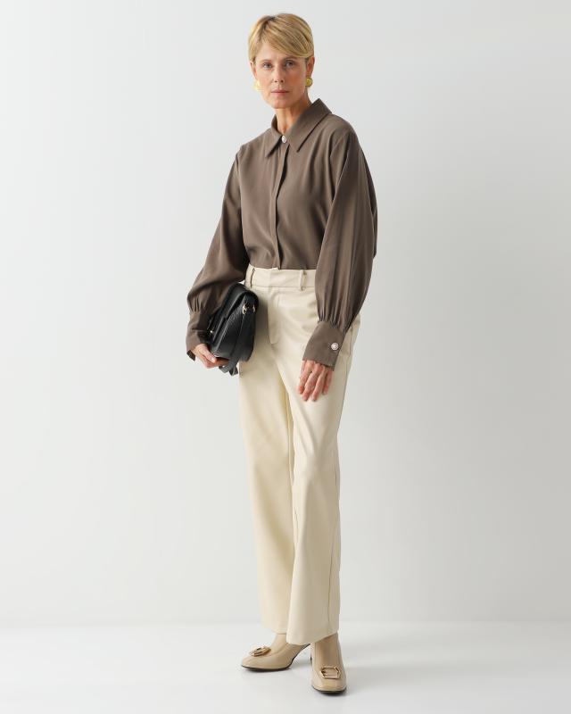 Стильная блузка вошла в коллекцию популярного бренда Calin Doux. Изделие с отложным воротником сшили из мягкой шелковистой вискозы, а чтобы материал был более долговечным – добавили прочные нити полиэстера. Мастера марки решили не нарушать лаконичность модели свободного кроя, поэтому пуговицы спрятали под планку. Но при этом не удержались, чтобы не добавить классической вещи небольшие декоративные элементы. Ими стали эффектные пуговицы у воротника и на манжетах. Такая блузка идеально впишется в офисный гардероб, а также дополнит повседневные образы. В коллекции представлены три оттенка: молочный, шоколадный и розовый.
