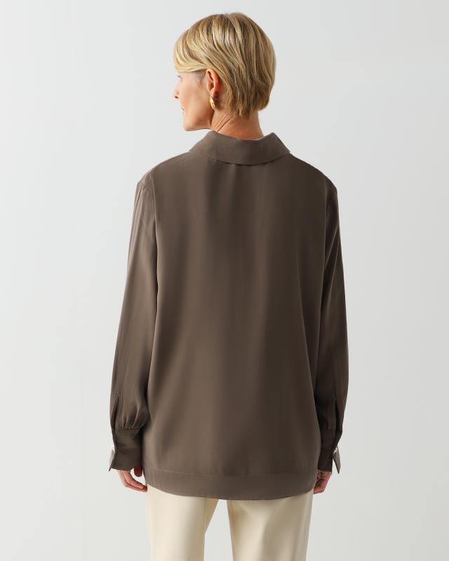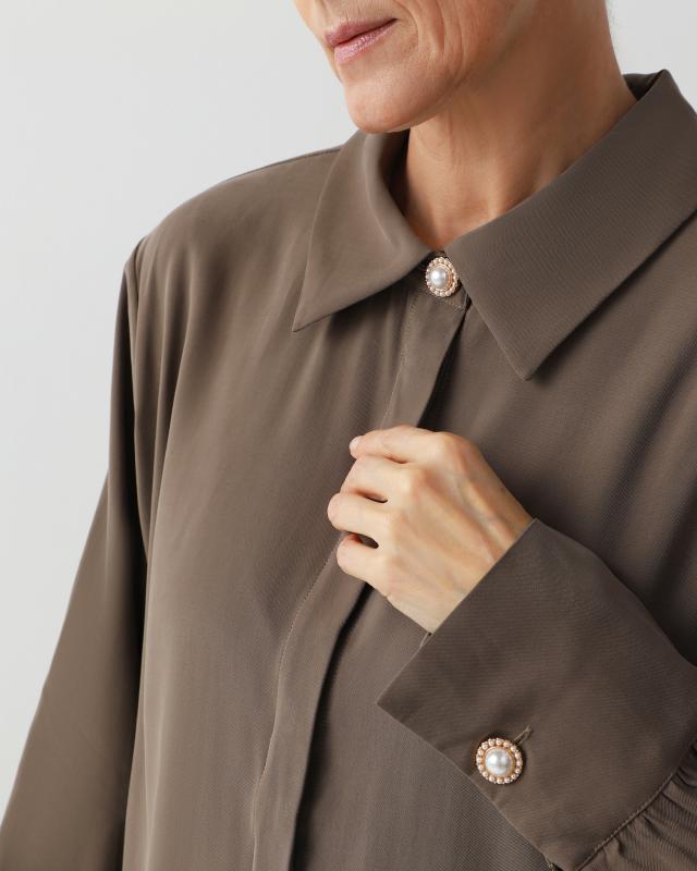 Как купить Свободная блуза из смесовой вискозы со скрытой застежкой и декоративной пуговицей на воротнике и манжетах?