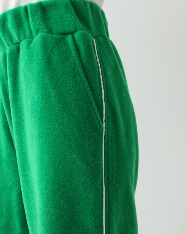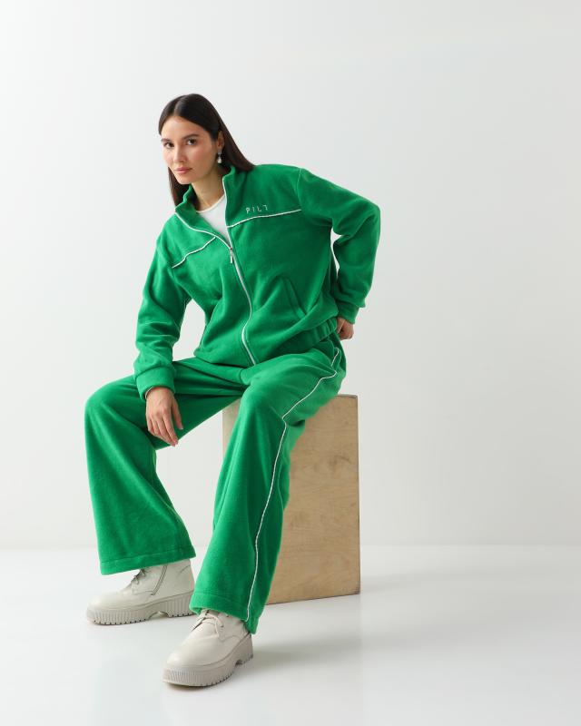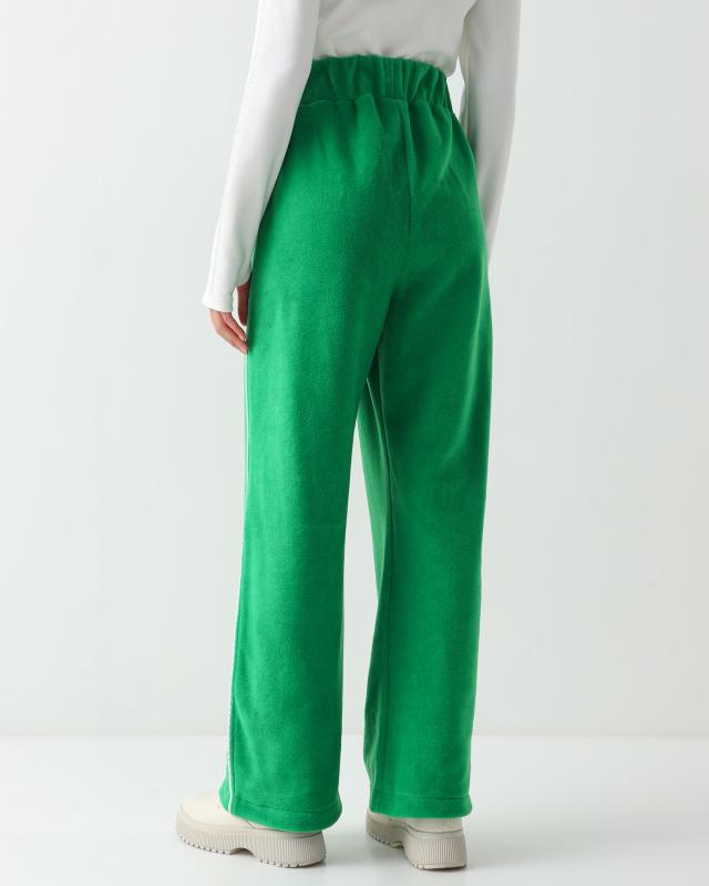 Для изготовления зеленых брюк из новой коллекции бренда Pill мастера марки использовали мягкий бархатистый материал. Модель прямого кроя дополнена боковыми карманами и контрастными тонкими лампасами белого оттенка. Эластичный пояс надежно фиксирует изделие на талии. Если вы хотите пополнить свой гардероб костюмом в спортивной эстетике, обратите внимание на толстовку из того же материала (арт. 183294).