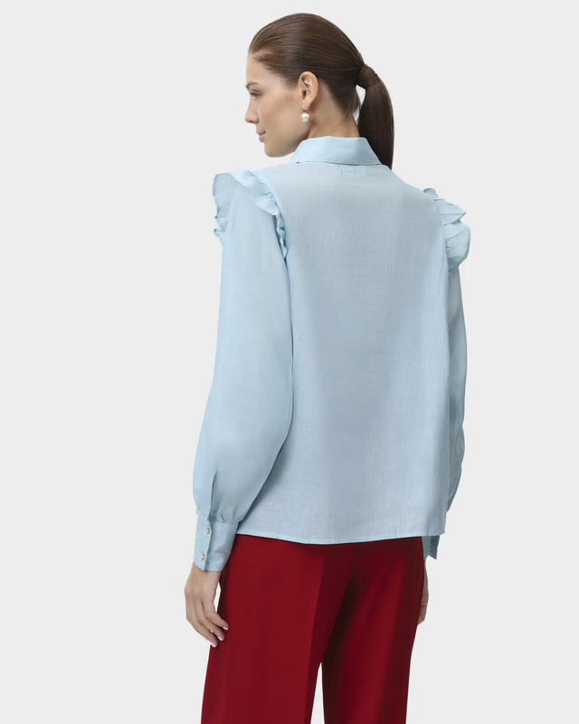 Блузка прямого кроя от бренда Soufflé выполнена из смеси хлопка и льна. Декоративная кокетка с оборкой на полочке добавит вашему образу женственности.