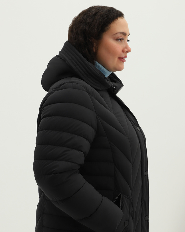 Утепленное пальто немецкого бренда Barbara Lebek – оптимальный вариант для зимнего сезона. Стежка-елочка выглядит очень стильно и актуально. Воротник-стойка и капюшон с опушкой из экомеха защитят от ветра и снега. Пальто застегивается на двухстороннюю молнию и ветрозащитную планку на кнопках. Пуллер молнии украшен логотипом бренда. По бокам разрезы на молнии, обеспечивающие свободу движений. Утеплено экопухом, обладающим высокими теплоизоляционными свойствами.