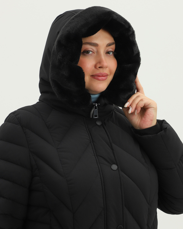 Как купить Стеганое пальто на экопухе с воротником-стойкой и капюшоном с опушкой из экомеха?
