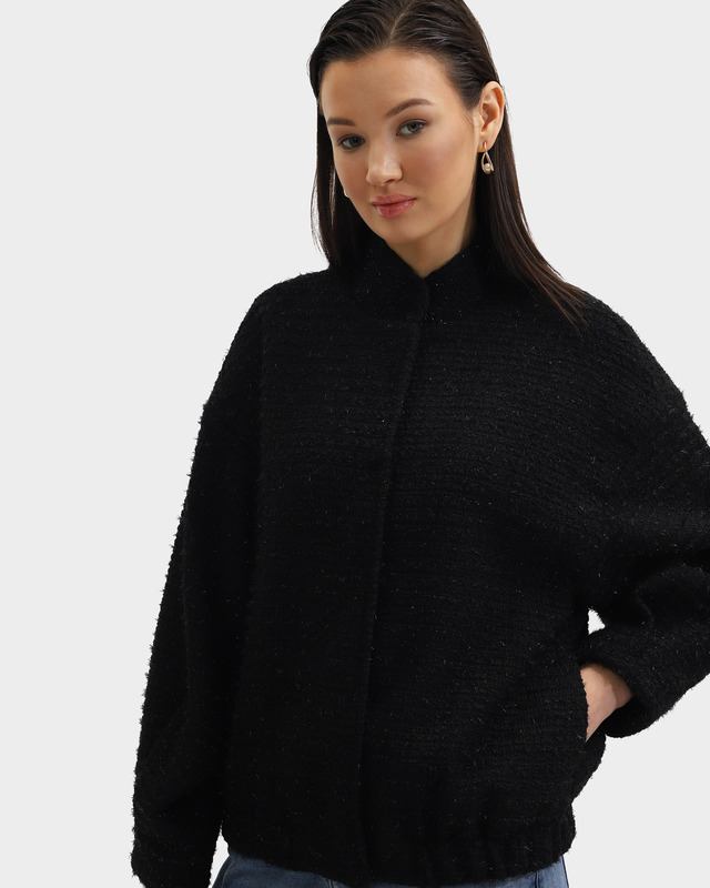 Как купить Куртка-бомбер из фактурной ткани с блестящей нитью и застежкой на скрытые кнопки?
