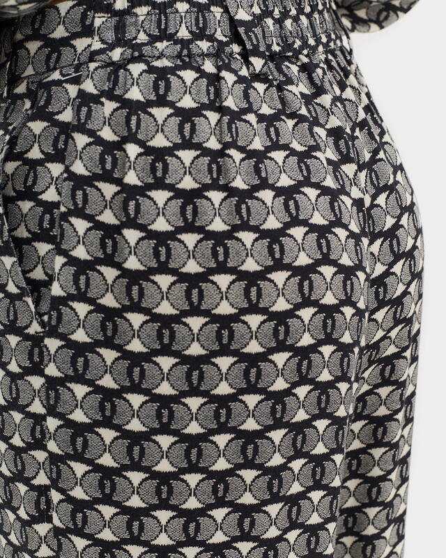 Укороченные брюки прямого кроя от немецкого бренда Bulmer выполнены из 100%-го района с геометрическим принтом и рибом по низу изделия.