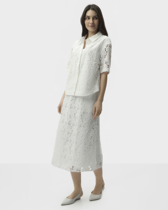 Ажурная миди-юбка кремового оттенка выполнена из мягкого кружева с цветочным узором. Чтобы найти баланс между провокацией и безупречным внешним видом, основу дополнили однотонной подкладкой, но широкий край оставили полупрозрачным. Изделие А-силуэта с эластичным поясом вошло в весенне-летнюю коллекцию бренда UNQ. Стилисты рекомендуют сочетать модель с боковыми прорезными карманами с блузкой – арт. 191829.