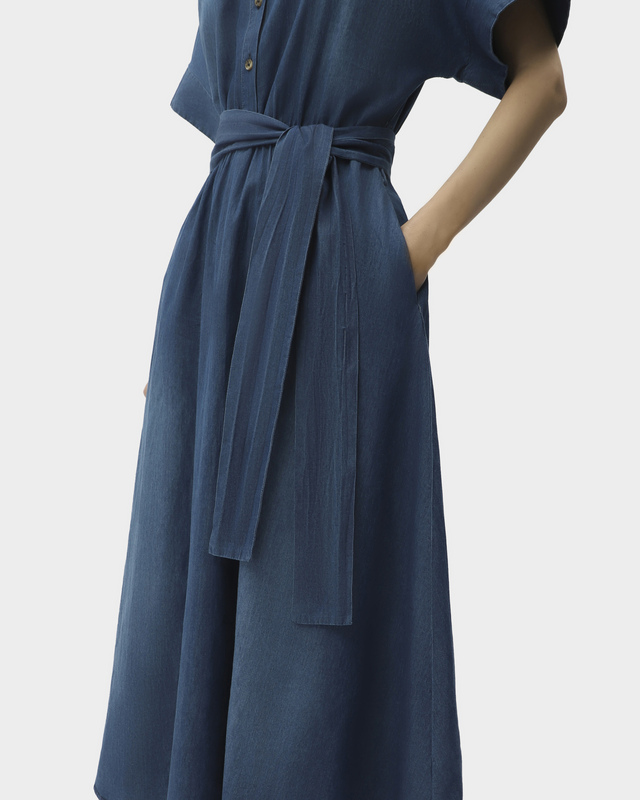 Джинсовое платье-рубашка миди из 100%-го хлопка – отличный выбор для летних образов. Эластичная вставка на талии обеспечивает идеальную посадку. В комплекте широкий пояс.