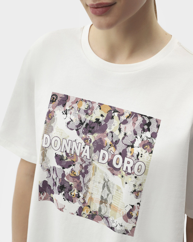 Эффектный принт делает белую футболку из весенне-летней коллекции итальянского бренда Donna D’Oro максимально эффектной и дарит ей летнее настроение. Рисунок дополнили крупным логотипом. За комфорт в течение дня отвечает мягкая ткань из натурального хлопка, которая хорошо пропускает воздух и приятно ощущается на теле. Футболка прямого кроя с круглым вырезом – прекрасный вариант для базового гардероба.