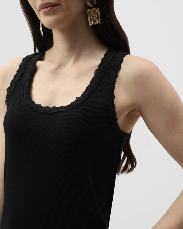 Блузка-топ выполнена из вискозы с добавлением эластана. Полуприлегающий крой модели подчеркивает фигуру, создавая аккуратный и стройный силуэт. Круглый вырез добавляет образу классики и утонченности, открывая ключицы и создавая визуальный акцент на шее. Кружевные вставки придают топу нотку женственности и романтичности. Отсутствие рукавов делает топ идеальным для теплой погоды, а также для сочетания с жакетами или кардиганами в прохладные дни.