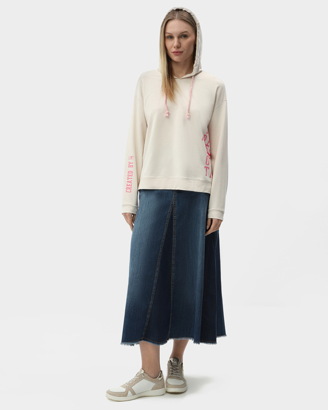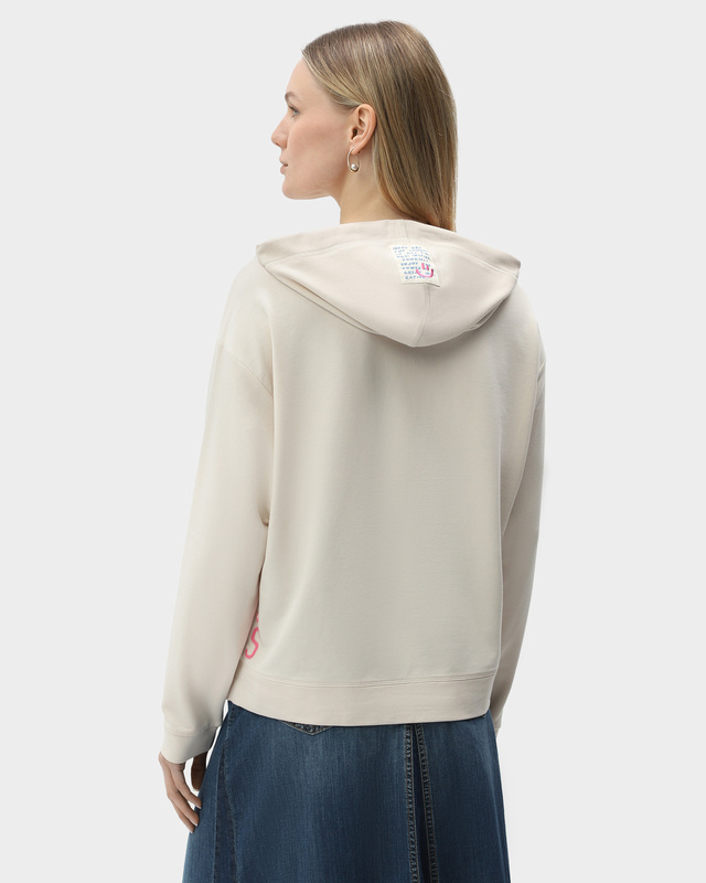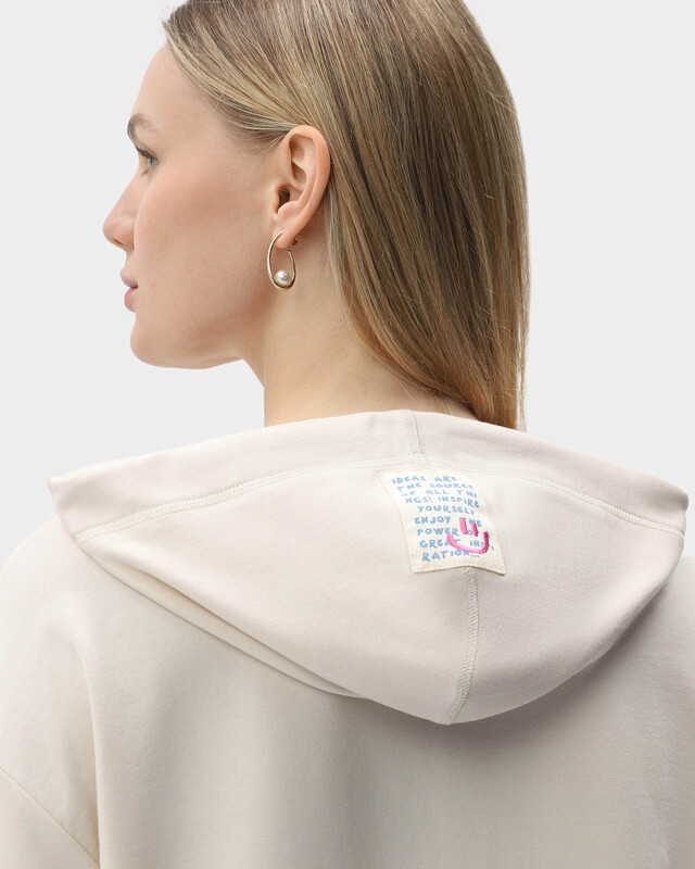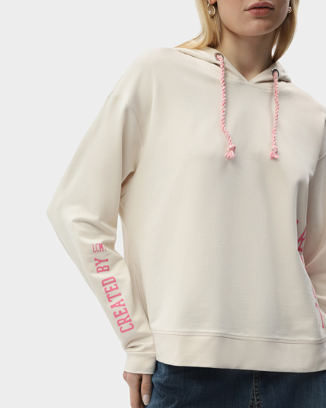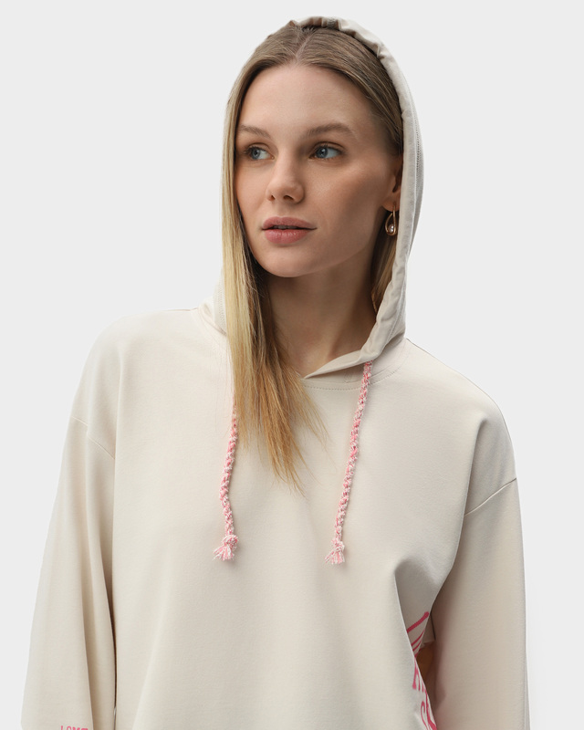 Худи прямого широкого кроя от бренда LeComte выполнена из мягкой смеси хлопка и модала. Капюшон с подкладкой и акцентным шнурком из буклированной нити. Современный леттеринг – принт на полочке и рукавах.