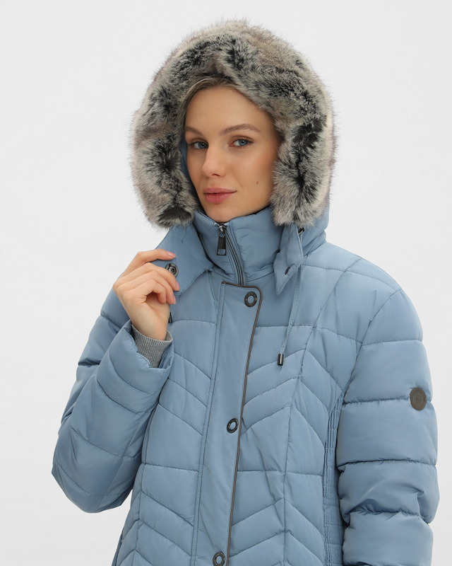 Как купить Стеганое пальто на утеплителе down free со съемным капюшоном с опушкой из экомеха?