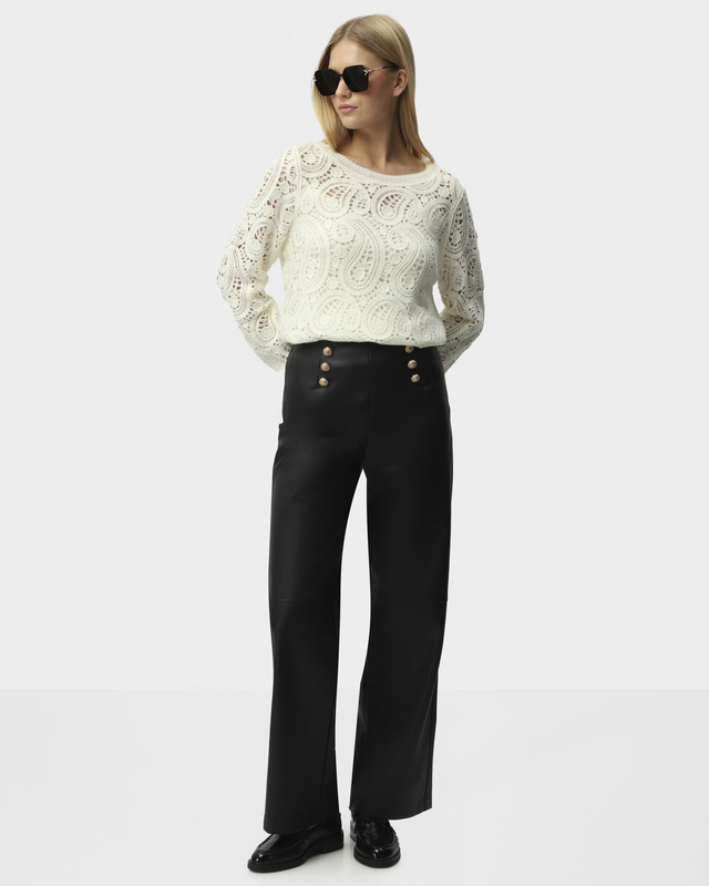 Пуловер прямого кроя от бренда Calin Doux выполнен из вязаной ткани с ажурным рисунком и элементами «турецкий огурец». Ажурный рисунок создает легкость и воздушность, придавая ткани интересную фактуру. Подкладочный топ, выполненный из того же материала, но в гладкой вязке, добавляет образу многослойности.