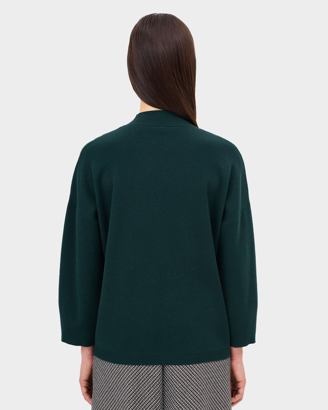 Дизайнеры немецкого бренда Bulmer включили в осенне-зимнюю коллекцию лаконичные трикотажные вещи с минимумом декора. Например, этот вязаный джемпер глубокого темно-зеленого оттенка. Модель с воротником-стойкой создана из мягкой пряжи на основе шелковистой вискозы. Благодаря плотной фактуре материала с добавлением кашемира, это изделие не только теплое, но и приятное к телу. Свободный силуэт oversize подарит комфорт в любой ситуации. Джемпер дополнен накладным карманом с мерцающим подзором. Эта базовая модель с укороченными рукавами длиной 7/8 легко впишется в любой образ, будь то повседневный, нарядный или офисный. Стилисты бренда рекомендуют сочетать его с бомбером (арт. 196665) и юбкой (арт. 196671).