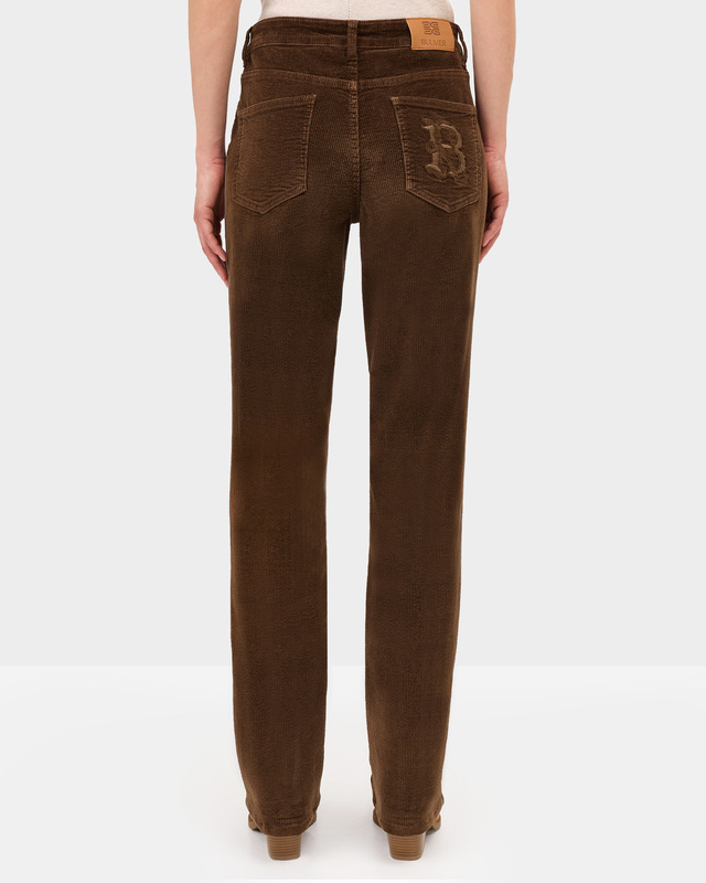 Вельветовые джинсы прямого кроя от немецкого бренда Bulmer выполнены из эластичного хлопка в тонкий рубчик. Дополнены вышивкой-монограммой на заднем кармане. Застегиваются на молнию и металлическую пуговицу.