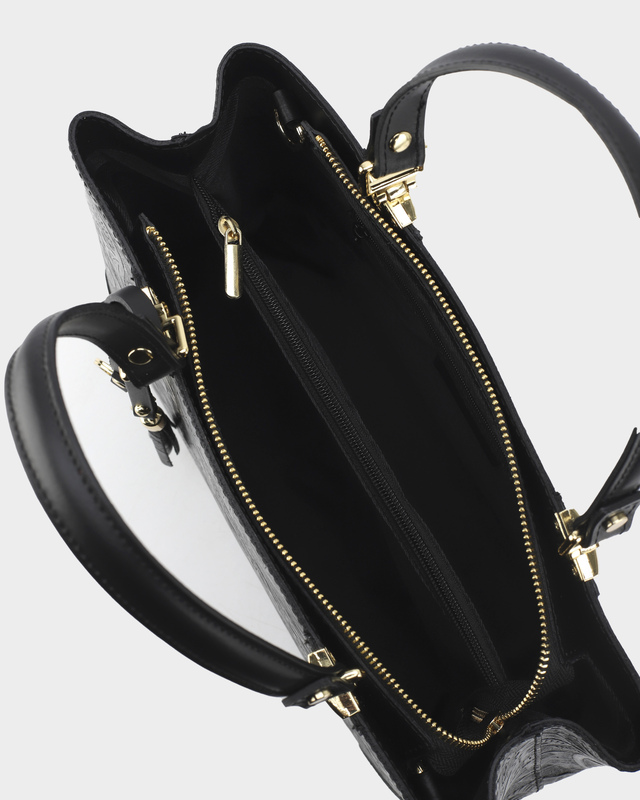 Продуманная внутренняя конструкция позволяет с легкостью разместить все необходимое: два отделения, разделенные карманом на молнии, застегиваются на молнию, также есть два открытых кармана и один на молнии. Съемный регулируемый ремень на карабинах обеспечивает несколько вариантов ношения: в руке или через плечо. Металлические ножки на дне защищают изделие от грязи и истирания.
