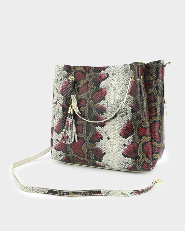 Эффектная кожаная сумка с принтом и фактурой под питона из коллекции итальянского бренда Passegiata. Модель в сером оттенке сочетает гладкую и зернистую кожу. Внутри 1 отделение. Съемная косметичка закрепляется снаружи на кнопки. Аксессуар дополнен несъемным брелоком-кистью. Металлические ножки защищают низ изделия от истирания. Съемный регулируемый плечевой ремень на карабинах позволяет носить аксессуар через плечо.