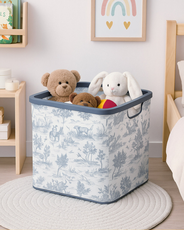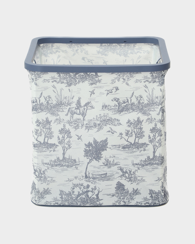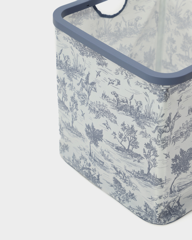 Корзина для хранения вещей позволяет легко организовать пространство. Верх выполнен из практичного влагоотталкивающего материала, внутри гибкие металлические спицы – крепкий каркас не даст корзине упасть или потерять форму. Благодаря квадратной форме ее удобно поставить в угол. Элегантный дизайн с узором в стиле туаль-де-жуи, классического французского одноцветного орнамента с пейзажами, пасторальными или жанровыми сценками, гармонично впишется в любой интерьер.