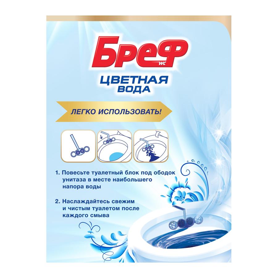 Туалетный блок Bref Color Aktiv С хлор-компонентом - это подвесной блок для унитаза для чистоты и гигиены с формулой 4 в 1. Современная формула шариков Bref содержит поверхностно-активные вещества и неорганические соли, благодаря чему обеспечивает гигиеническую чистоту, защиту от бактерий, а значит здоровье и безопасность для всей семьи. - Эффективные растворяющие компоненты в составе шариков окрашивают воду в синий цвет, благодаря чему достигается эффект чистоты. - Шарики Бреф обеспечат свежесть в санитарной комнате без использования дополнительных освежителей. - Использование блока Бреф убережет вашу сантехнику от известковых и солевых отложений, ржавчины и надолго продлит эксплуатацию. - Средство содержит шарики с интенсивным хлор-компонентом. При каждом смывании унитаз получает чистоту и дезинфицирующий эффект. - Формула туалетного блока создает обильную пену, которая покрывает слой воды в унитазе, эффективно борется с грязью.Особенности:без фосфатов Состав:> 30 % солей неорганических, анионных П А В; 5-15 % неионогенных П А В; < 5 % красителя, комплексообразователя, хлорактивного компонента растворителя, отдушки (в т.ч. лимонена, бутилфенил метилпропионаля,Характеристики:Туалет - общий уход Рекомендации:1. Повесьте Bref Color Aktiv под ободок Вашего унитаза 2. Выберите положение блока как можно ближе к струе воды 3. Замените блок, когда он закончится Условия хранения:Хранить в сухом месте при температуре от +5 до +40°С