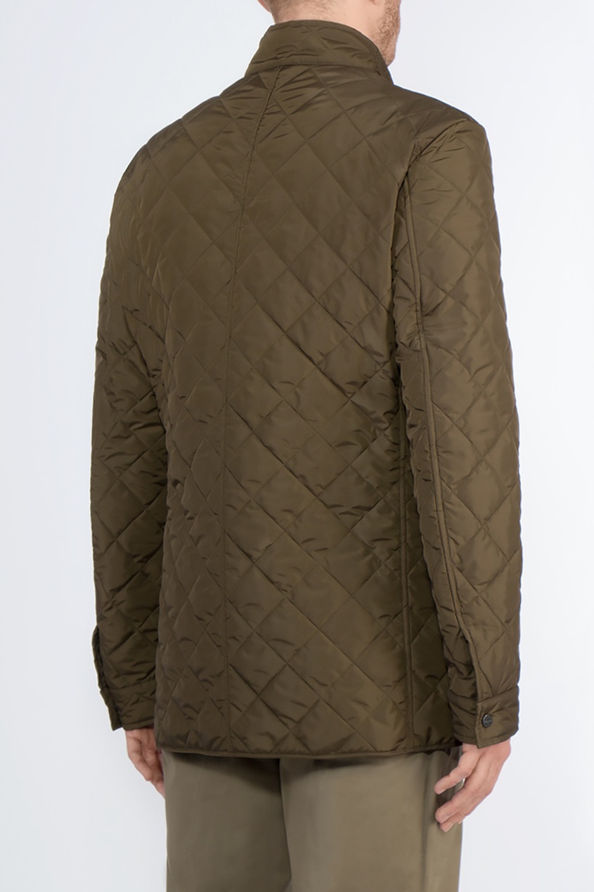 Куртка изготовлена из стеганой ткани коричневого цвета. Модель с длинными рукавами дополнена накладными карманами с клапанами и прорезным на молнии. Воротник-стойка декорирован ремешком с пряжкой.