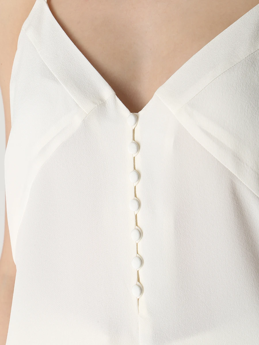 -Модель свободного кроя с узкими регулируемыми бретелями, V-образным вырезом на груди, который продолжает ряд обтяжных пуговиц с воздушными петлями.