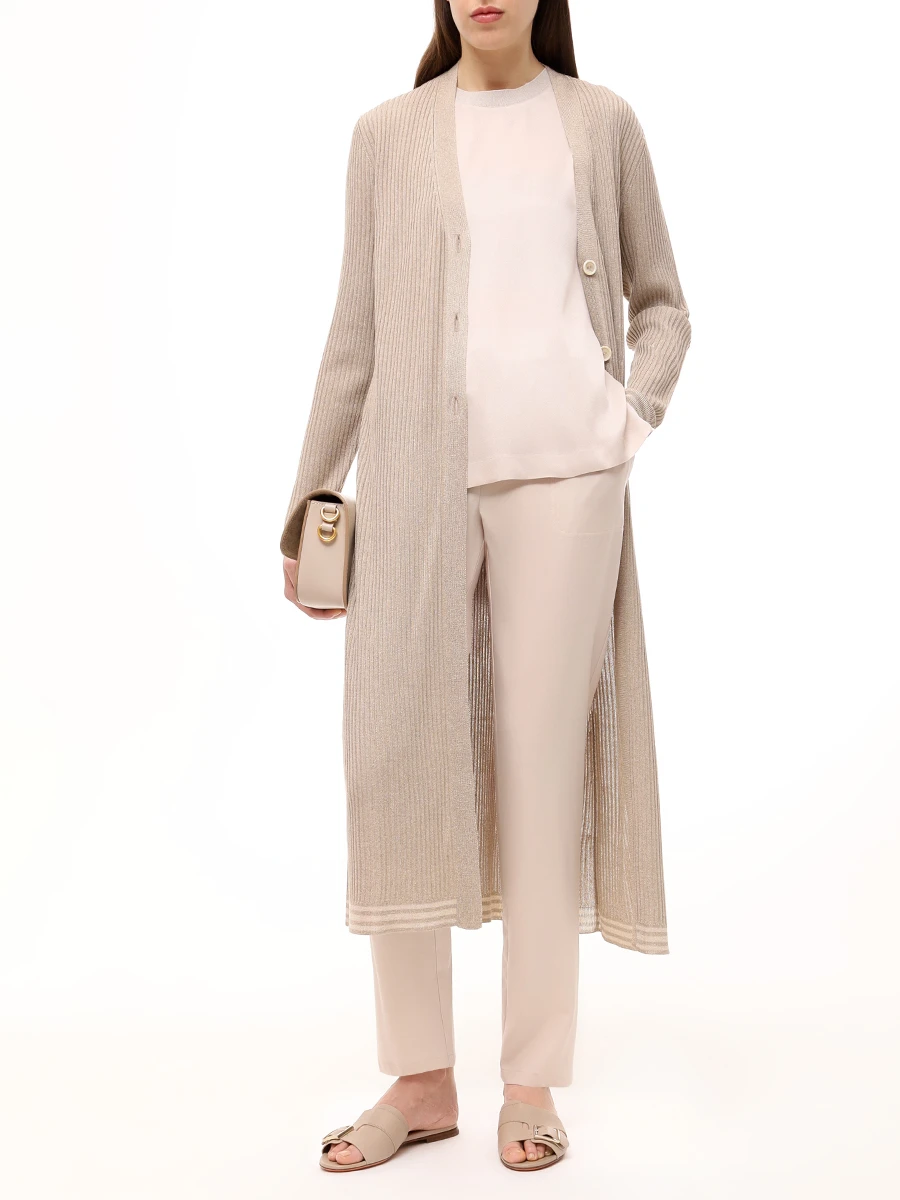 -Модель свободного кроя с круглым вырезом горловины с трикотажной отделкой дополнит как классические образы в качестве базы, так и комплект-тройку с брюками и рубашкой из той же ткани коллекции бренда.