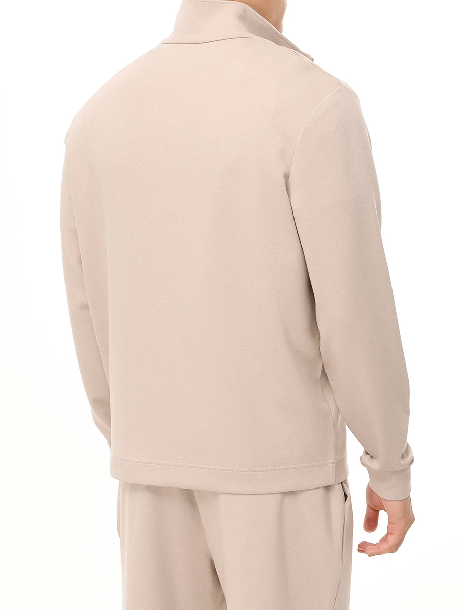 -Толстовка свободного кроя с длинными рукавами, эластичными манжетами, воротником-стойкой, застежкой на молнию на груди.