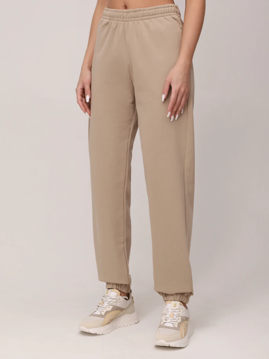 -Брюки свободного кроя со стандартной посадкой, эластичным поясом, манжетами на резинке в нижней части брючин, прорезными карманами.