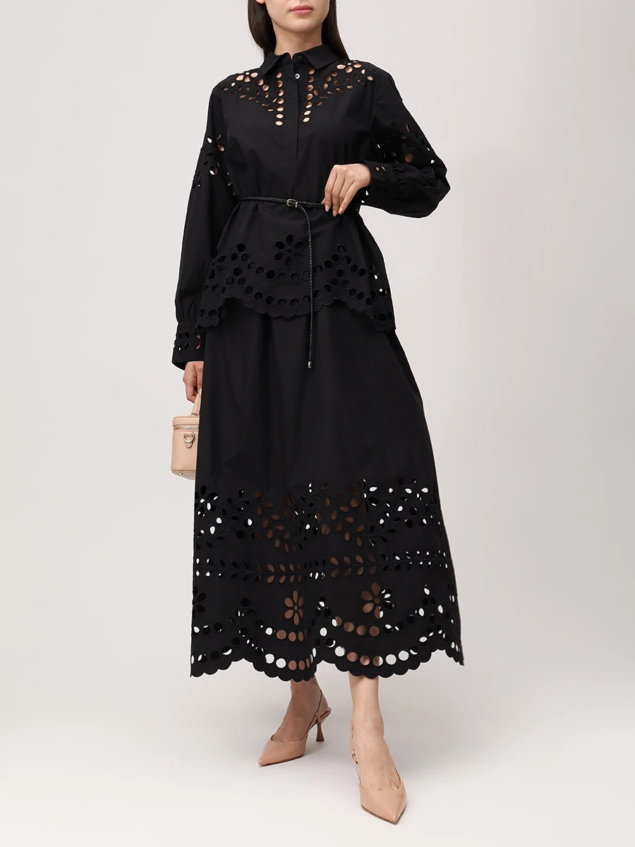 -Модель расклешенного кроя с широким эластичным поясом, который регулирует посадку на талии и отделкой изящной вышивкой ришелье.
